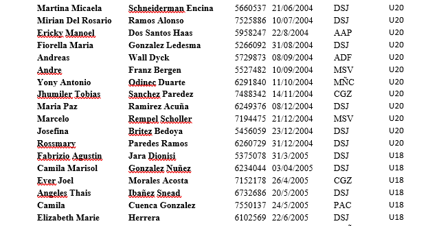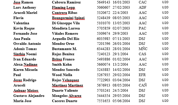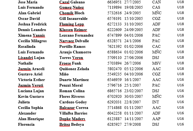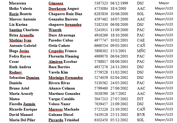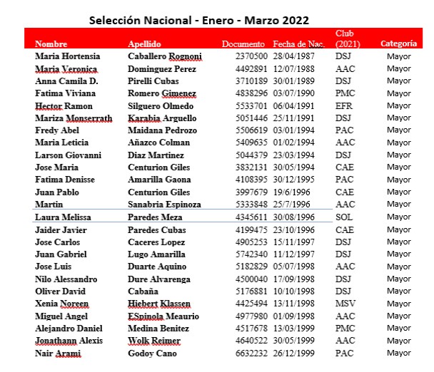 La Federación Paraguaya informa a los clubes, atletas federados y demás interesados que, de conformidad a lo establecido en el Reglamento Técnico, se ha establecido la lista de atletas considerados como “Selección Nacional” en las diversas categorías establecidas. Estos atletas para ser elegibles a eventos internacionales deben cumplir con las obligaciones establecidas en el Anexo 3 del mencionado Reglamento Técnico.